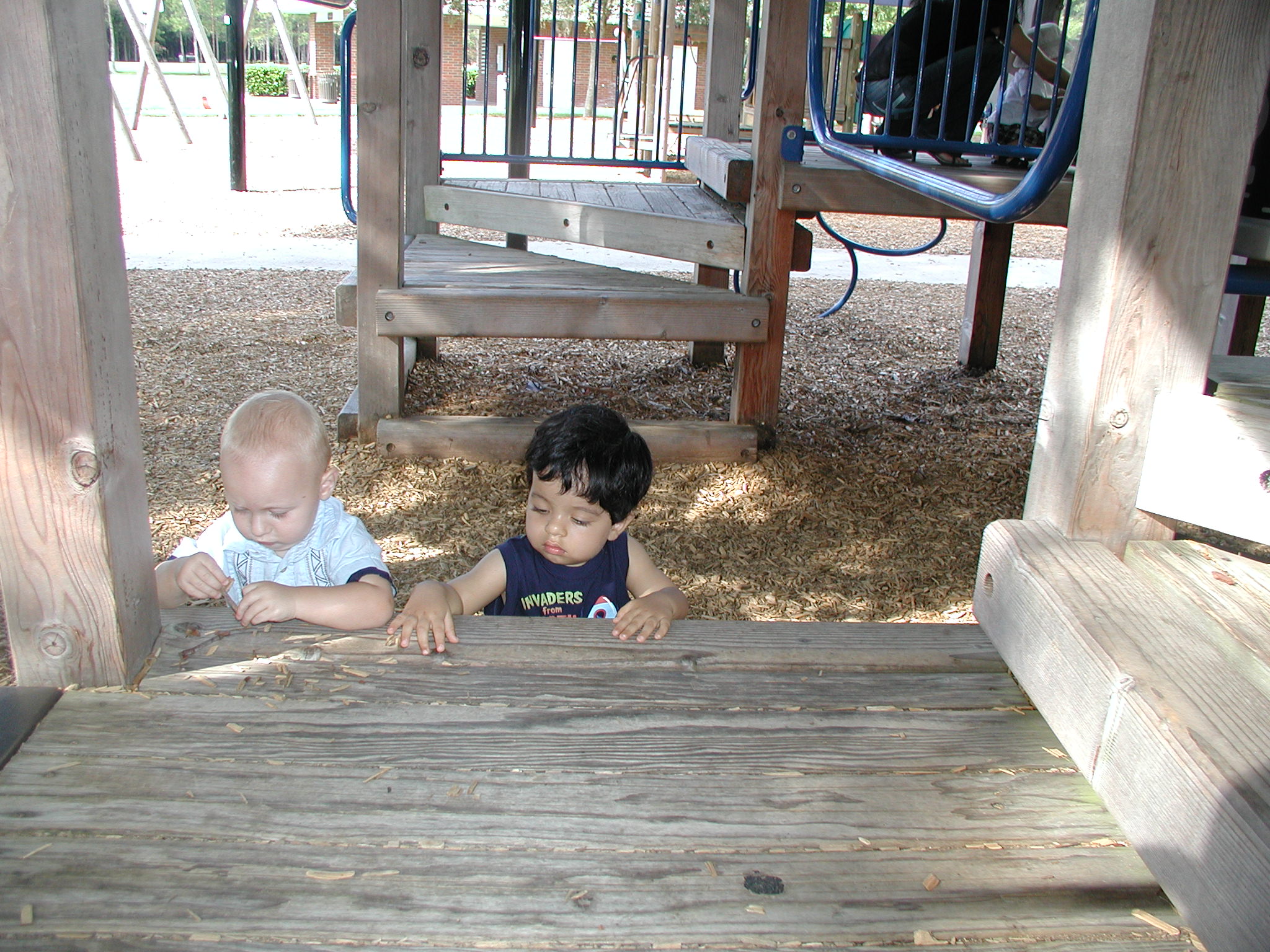| Studiously playing with the mulch |