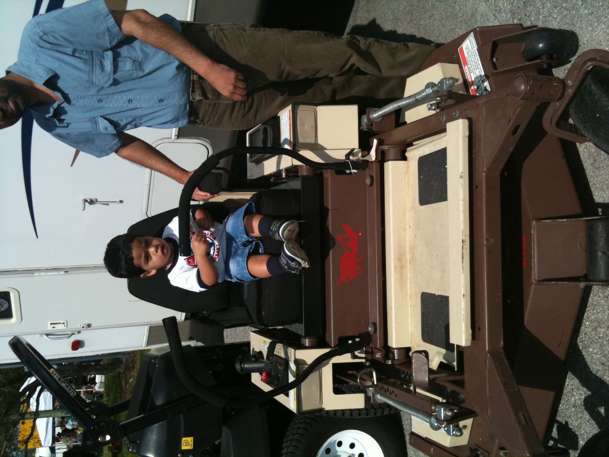 | Rohan in a riding lawn mower. This is what Rohan will get for his 5th birthday. He can cut all the lawns in the neighbourhood and pay for his boarding and lodging |