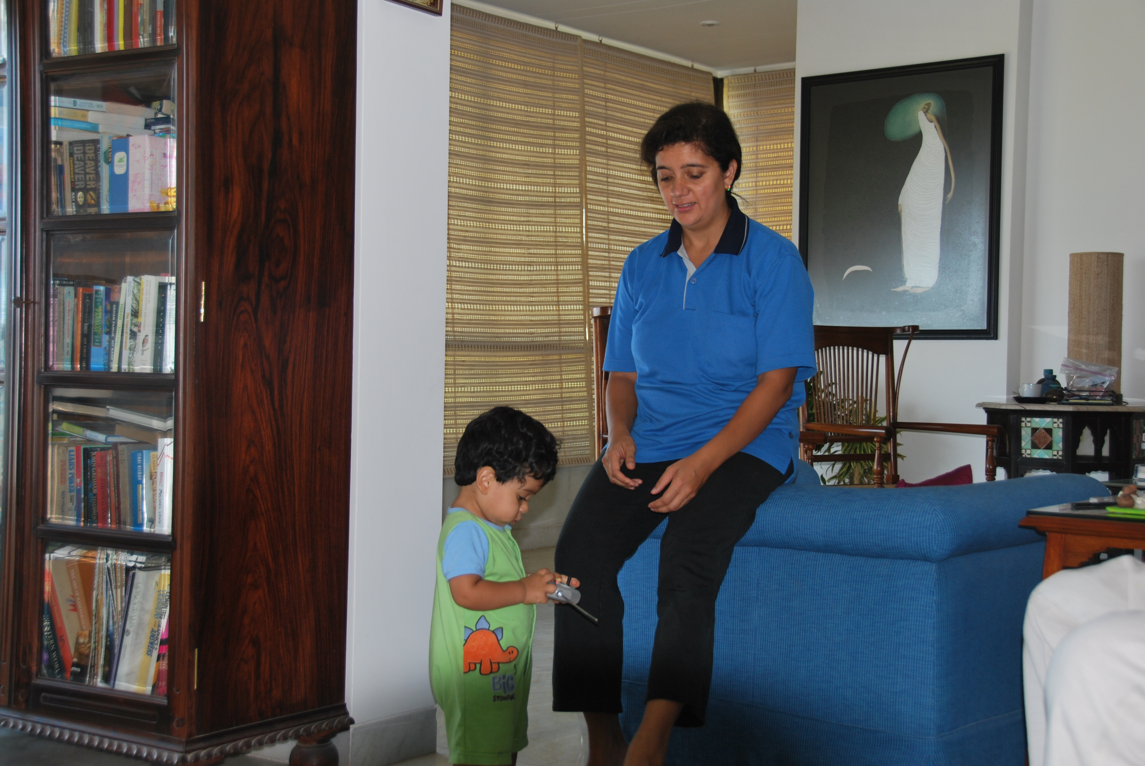 | Rohan with his Mama. Rohan is studiously trying to dismantle a phone. |